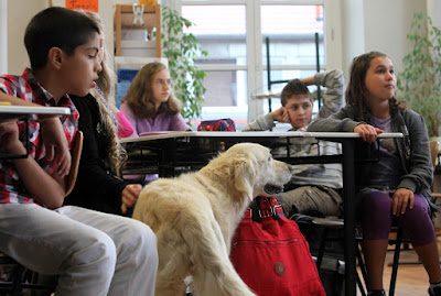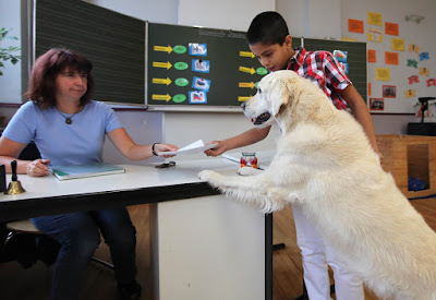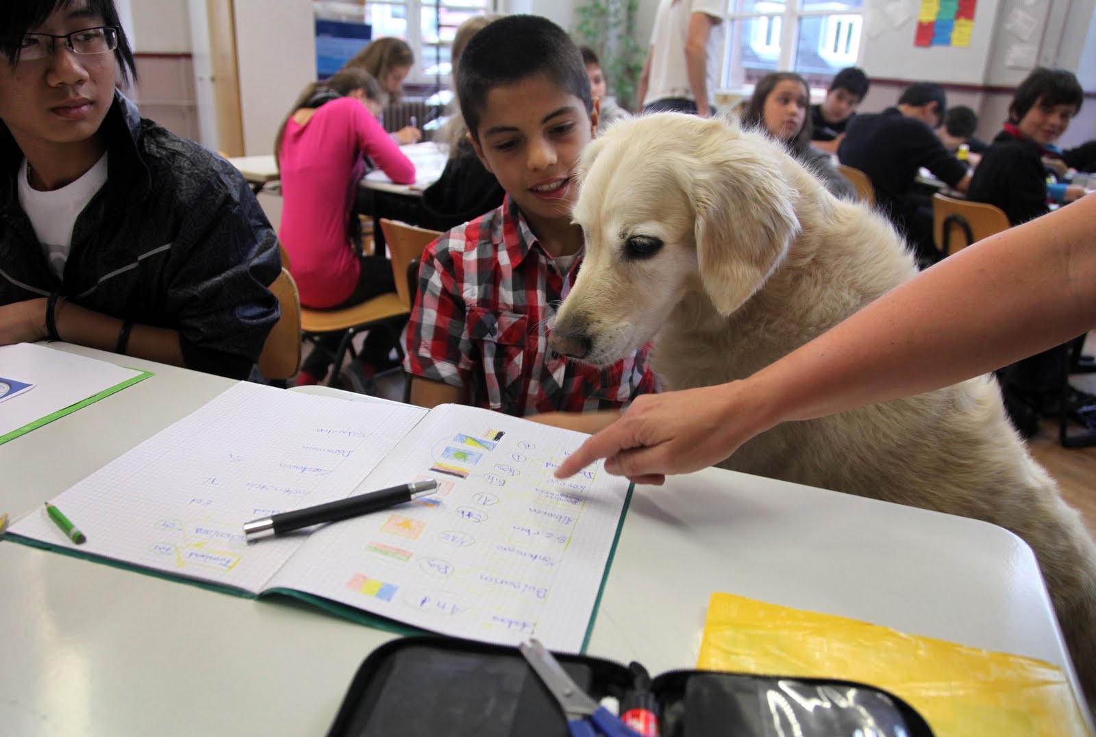 A golden retriever Paula (nas fotos), de 6 anos, é um dos pets que acompanha uma turma do colégio Leopoldschule, em Karlsruhe. A cadela está presente durante as lições e dá bom exemplo de comportamento para a classe. Todos os estudantes têm de ajudar a cuidar dela.